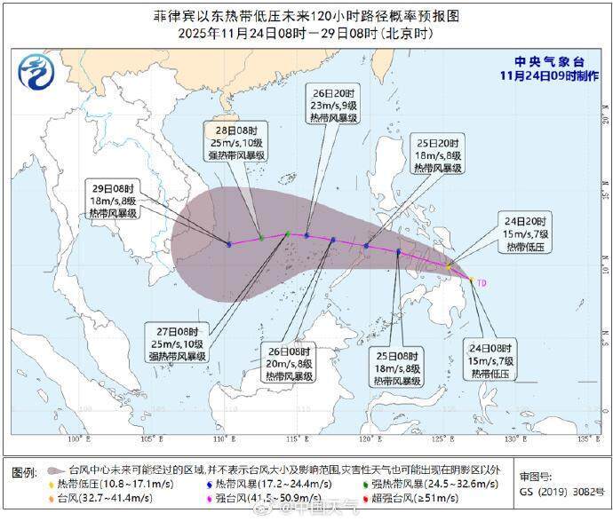 没错,即将进入12月,新的台风还在“上新”——昨日,菲律宾以东热带扰动已加强为热带低压,预计将成为今年第27号台风,并于25日夜间进入南海南部海域,强度缓慢加强,最强可达强热带风暴级(25-28米/秒,10级)。
